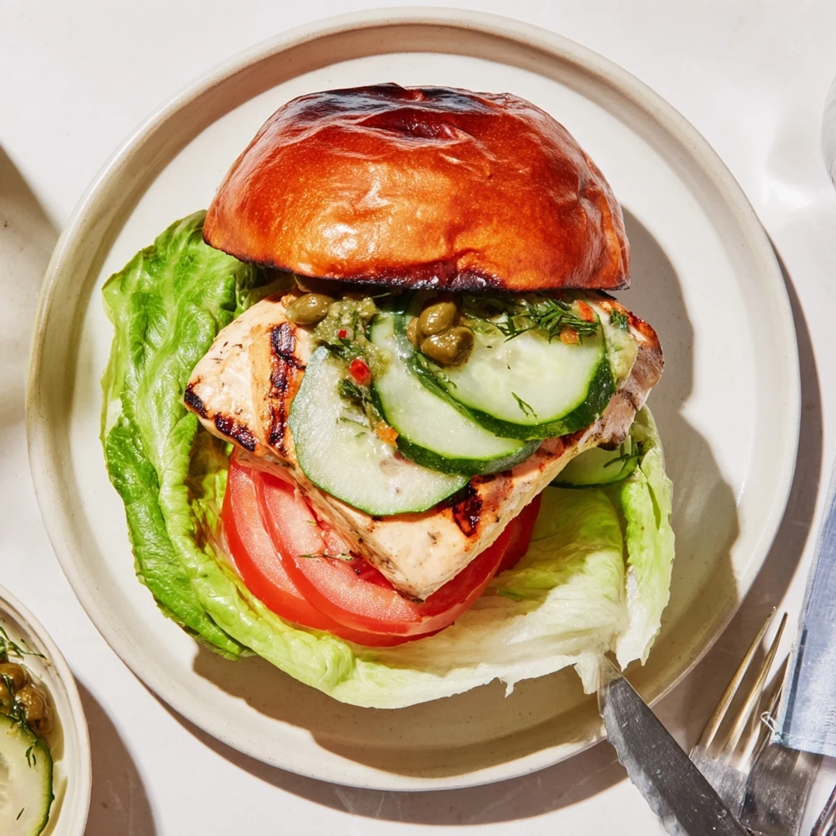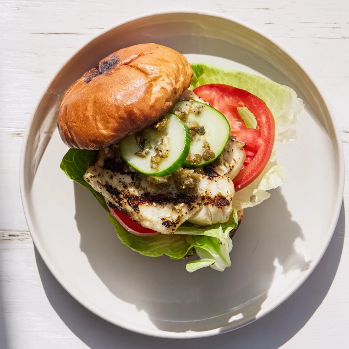 - Spread a generous layer of that grilled lemon jalapeño tartare on both bun halves. Stack it up with grilled cos lettuce on the bottom, followed by the barramundi fillet, tomato slices, and cucumber. Crown with the top bun.