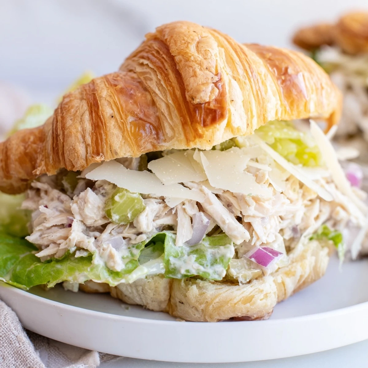 - Add extra Parmesan shavings on top if you're feeling fancy then gently fold the top of each croissant over. Serve right away while the croissant is still flaky and the chicken salad is cold.
