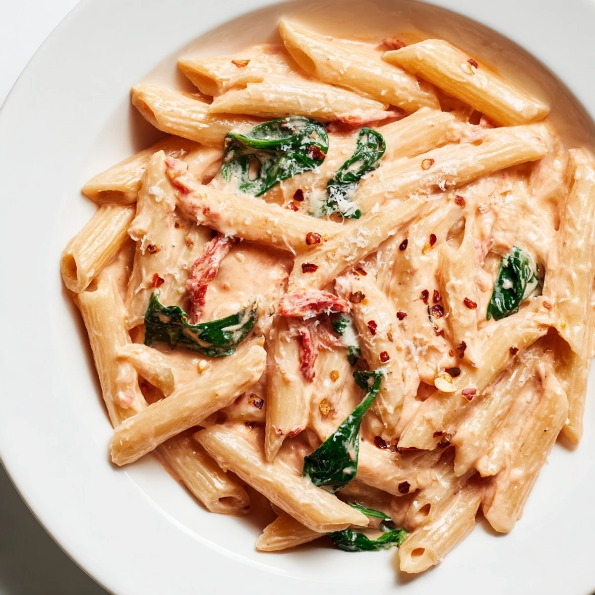 This satisfying one-pan pasta combines sun-dried tomatoes and fresh spinach in a luxurious cream sauce that coats every strand. The pasta cooks directly in vegetable broth, absorbing flavor while creating a naturally thickened base. Heavy cream and Parmesan add richness, while garlic and Italian herbs provide aromatic depth. Perfect for weeknight dinners when you crave restaurant-quality Italian comfort without the cleanup.