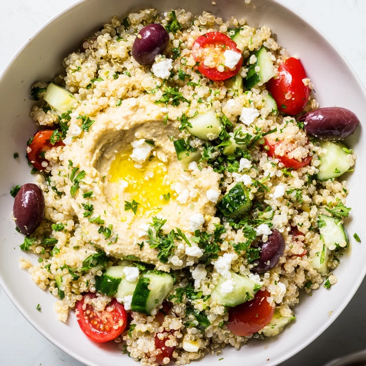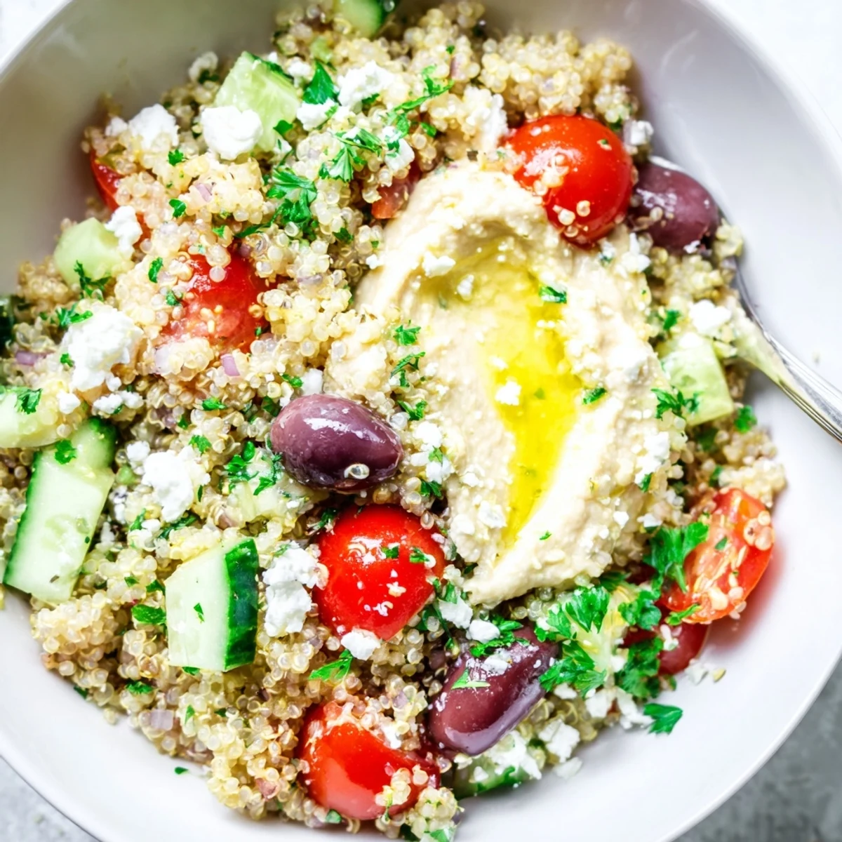 Assemble by layering cooked quinoa with fresh vegetables, drizzle with dressing, add a generous scoop of hummus, and top with crumbled feta and fresh parsley. Naturally vegetarian and gluten-free, this bowl works beautifully for meal prep and keeps refrigerated for up to two days. Customize with grilled chicken, chickpeas, or roasted vegetables for added protein.