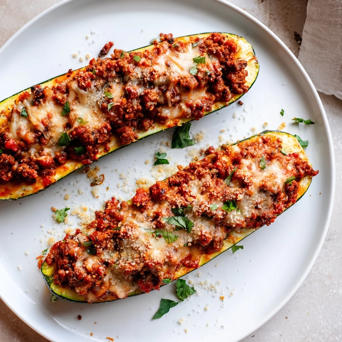 - Arrange zucchini halves in a baking dish and fill each with the beef mixture, pressing down lightly to pack it in. Mound it slightly above the edges for that appealing overflow.